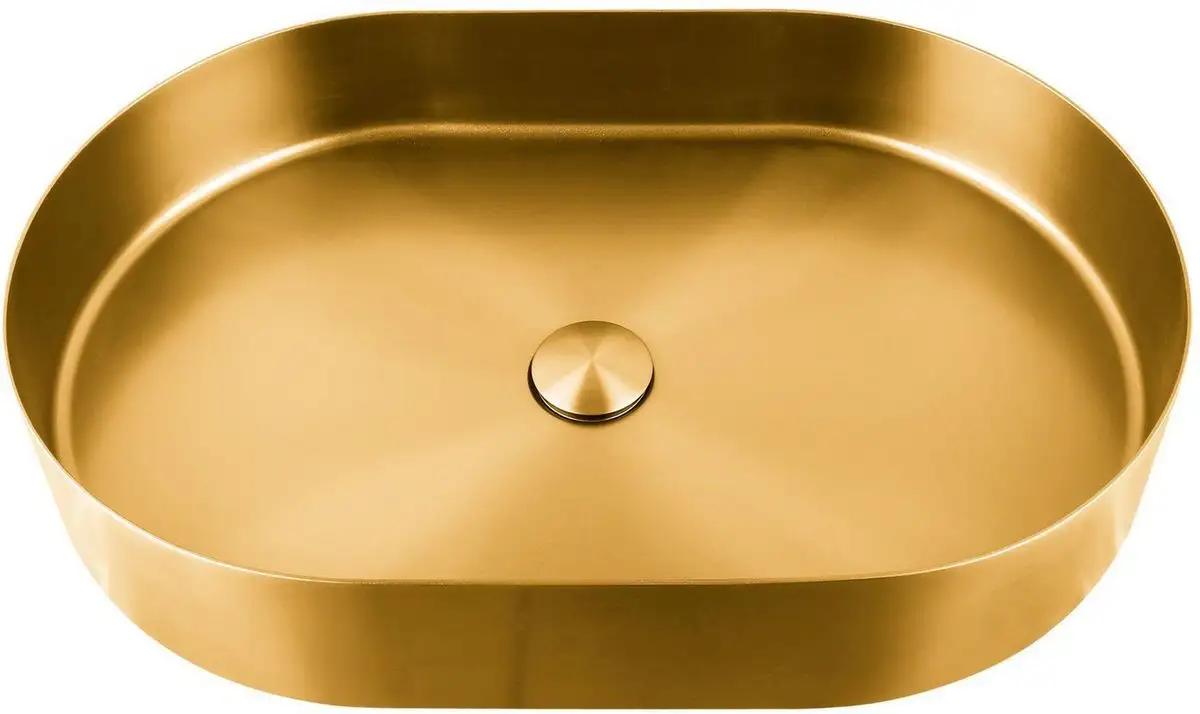 Умывальник Altrobagno Eterno 001025 OrSp имеет овальную форму и состоит из одной чаши. Он крепится накладным способом на мебельный шкаф или столешницу. Устройство изготовлено из прочного металла и окрашено в золотой цвет, что добавляет стильный вид ванной комнате. Умывальник предназначен для установки с отдельностоящим смесителем, поэтому его удобнее использовать с подходящей сантехникой. В конструкции отсутствует перелив и отверстие под смеситель, что позволяет сохранить элегантный внешний вид. В комплект входит донный клапан для слива воды, что обеспечивает его удобное использование. Кронштейны, крепеж и сливная арматура не поставляются в комплекте, их нужно приобретать отдельно. Размеры умывальника — ширина 59,6 см, глубина 39,6 см, высота 11 см, что позволяет удобно разместить его в любой ванной комнате.