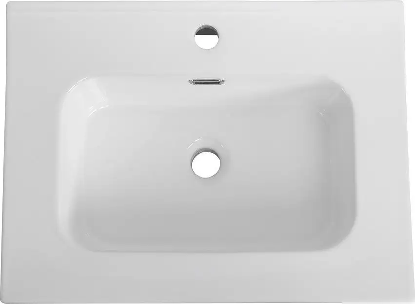 Умывальник Cezares CZR-8095-60 presented in a sleek white color with a rectangular shape. It features a single ceramic bowl, which makes cleaning and maintenance easy. The washbasin is designed as an over-the-counter model, mounted onto a furniture cabinet for stability. It includes a built-in overflow for safety and an opening for the faucet installation. The dimensions are compact: 61 cm wide, 46 cm deep, and 17 cm high, fitting well into most bathrooms. The product does not come with a towel holder, pedestal, or shelves, focusing on simplicity and utility. It is ideal for those who want a modern look and functional design in their bathroom. The material used is high-quality sanitary ceramic, known for durability and ease of cleaning. The sink's straightforward construction makes it suitable for various bathroom styles.