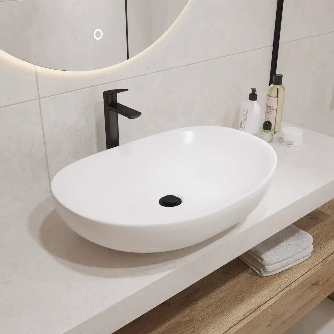 Умывальник Lauter 21502 имеет овальную форму и сделан из санитарной керамики. Его размеры — 63 см в длину и 42 см в ширину, что делает его удобным для использования в любой ванной комнате. Он устанавливается накладным способом на столешницу, что облегчает монтаж и уход. В конструкции отсутствует перелив и отверстие под смеситель, поэтому потребуется учитывать это при выборе оборудования. У закрытых кромок эргономичный дизайн, а гладкая поверхность легко очищается и устойчива к загрязнениям. Такой умывальник подходит для тех, кто ценит простоту и функциональность в интерьере ванной комнаты.