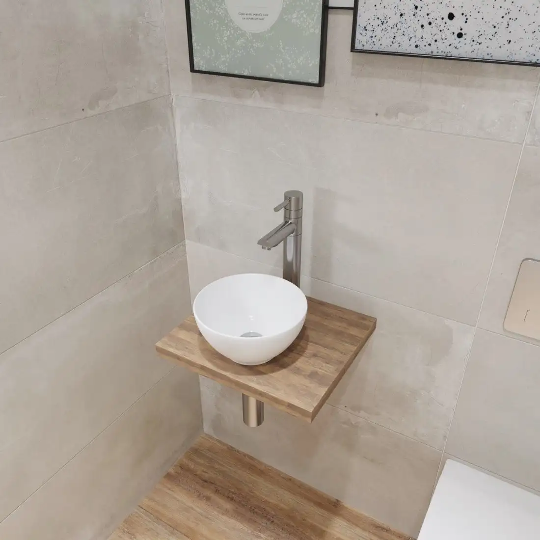 Умывальник Lauter 21601E имеет круглую форму и выполнен из санитарной керамики белого цвета. Он устанавливается на столешницу и занимает минимальное пространство благодаря глубине всего 24 см. В этой модели нет отверстий для смесителя и перелива, что упрощает монтаж и использование. Благодаря гладкой поверхности и антибактериальному покрытию его легко мыть и он более гигиеничный. Умывальник не комплектуется полками, шкафами или полотенцедержателем, что делает его простым и компактным решением для небольшой ванной комнаты.