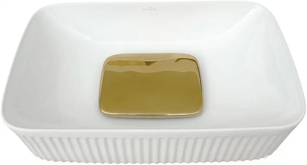 Умывальник Roxen Pablo Gold сочетает стильный белый и золотой цвет и имеет прямоугольную форму, которая хорошо вписывается в любую ванную комнату. Он выполнен из прочного фарфора, что обеспечивает долгий срок службы и легкость в уходе. Умывальник устанавливается накладным способом на мебельный шкаф или столешницу, что позволяет выбрать оптимальный вариант крепления. Благодаря отсутствию отверстия под смеситель и перелива, он подходит для использования с отдельностоящими смесителями, что дает больше вариантов дизайна. Размеры изделия: ширина 56 см, глубина 35 см и высота 14 см, что удобно для использования и занимает мало места. Умывальник не оснащен полотенцедержателем, сливной арматурой или другими дополнительными элементами, что облегчает установку и уход. Простая форма и гладкая поверхность позволяют легко следить за чистотой и сохранять свежий вид. Этот вариант отлично подойдет для тех, кто ищет стильное и практичное решение для ванной комнаты.