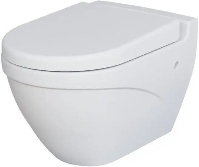 подвесной, конструкция: без бачка, задний подвод воды, горизонтальный выпуск, с сиденьем, безободковый