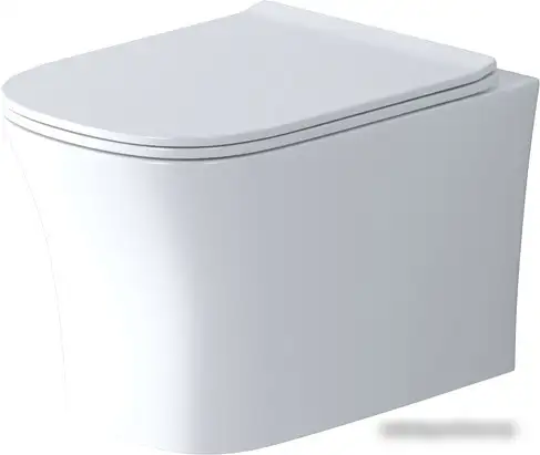 подвесной, конструкция: без бачка, нижний подвод воды, горизонтальный выпуск, с сиденьем, безободковый