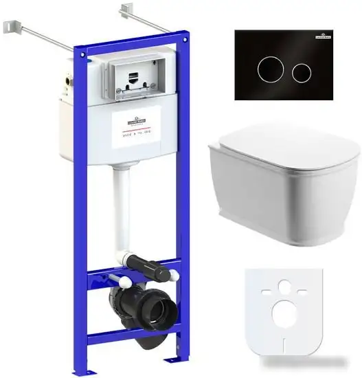 подвесной, без бачка, задний подвод воды, горизонтальный выпуск, двухрежимный слив, с сиденьем