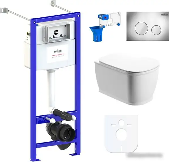 подвесной, конструкция: без бачка, задний подвод воды, горизонтальный выпуск, двухрежимный слив, с сиденьем