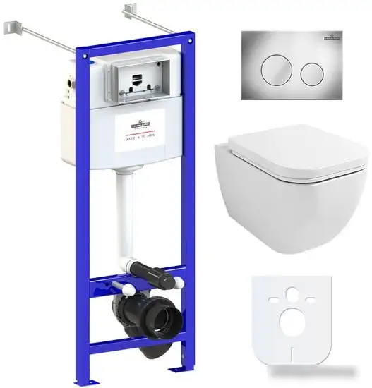 подвесной, без бачка, задний подвод воды, горизонтальный выпуск, двухрежимный слив, с сиденьем