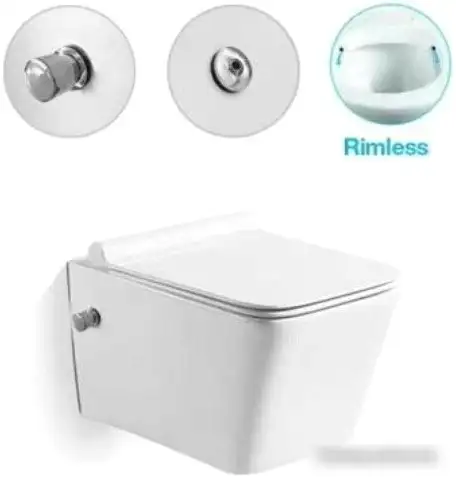 подвесной (с биде), конструкция: без бачка, задний подвод воды, горизонтальный выпуск, с сиденьем, безободковый