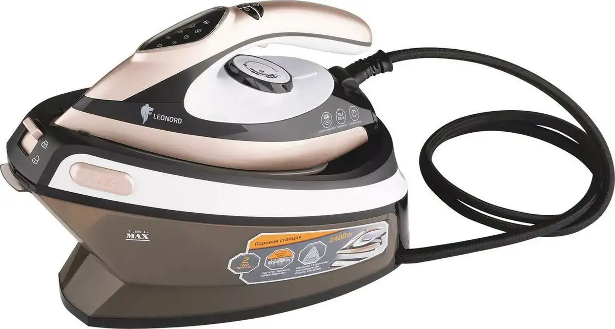Утюг Leonord LE-1806 имеет керамическую подошву UltraGlide, которая легко скользит по разным тканям. Он подключается к сети и обеспечивает постоянную подачу пара мощностью до 110 г/мин с возможностью регулировки. Максимальное давление пара составляет 5,5 бар, что помогает быстро разгладить даже самые сложные складки. Функция вертикального отпаривания позволяет гладить одежду прямо на вешалке. Объем резервуара для воды — 1500 мл, он позволяет долго гладить без дозаправки. У утюга есть автоматическое отключение для безопасной работы. Он весит 3,5 кг, что обеспечивает стабильное давление и эффективность глажки. Нет функции спрея и противокапельной системы, но он подходит для большинства тканей. Устройство удобно использовать в домашних условиях для быстрой и качественной глажки.