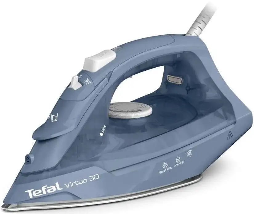 Утюг Tefal Virtuo 30 FV2C60E0 легко справляется с глажкой благодаря мощной отдаче 2200 Вт и керамической подошве, которая быстро нагревается и равномерно распределяет тепло. Он работает с паром, который постоянно подается со скоростью 30 г/мин, а паровой удар достигает 140 г/мин, что удобно для удаления даже сильных складок. Встроенная система защиты от накипи и противокапельная функция помогают поддерживать утюг в хорошем состоянии и избегать нежелательных пятен на одежде. Объем резервуара для воды 240 мл позволяет долго работать без долива, а регулировка подачи пара обеспечивает комфорт при глажке разных тканей. Утюг оснащен функцией вертикального отпаривания и автоматическим отключением для повышения безопасности использования. Он не имеет управления через смартфон и не включает гладильную доску или насадку для деликатных тканей. Благодаря длинному шнуру 1.9 м, утюг удобно использовать дома или на рабочем месте.