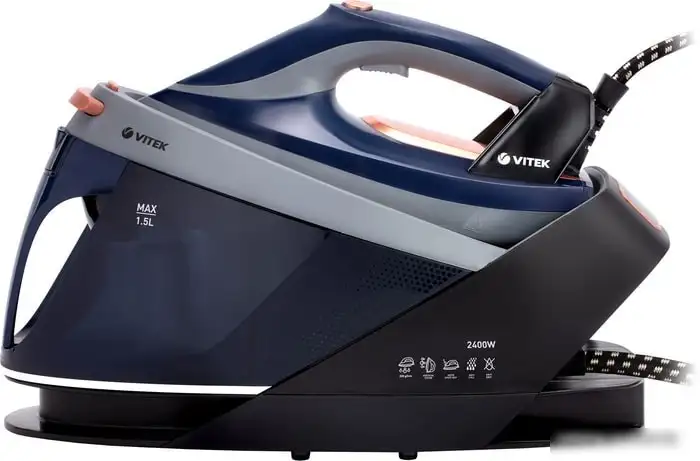 Утюг Vitek VT-2430 — это устройство с мощностью 2 400 Вт, которое отлично подходит для качественной глажки. Он оснащён подошвой из керамики UniCera, которая легко скользит по разным тканям и защищает их от повреждений. В утюге есть резервуар для воды объёмом 1 500 мл, что позволяет долго гладить без частой заправки. Постоянная подача пара достигает 110 г/мин, а паровой удар — 220 г/мин, что помогает быстро разгладить даже самые сложные складки. Также утюг поддерживает вертикальное отпаривание, подходит для одежды на вешалке, и имеет систему защиты от накипи для долговечности. Он автоматически отключается для безопасности и не имеет системы автоматической регулировки температуры для разных тканей. Внешний дизайн выполнен в тёмно-синем и чёрных цветах, делая утюг стильным и современным.