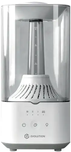 Увлажнитель воздуха Evolution HF-878 работает от сети 220В и использует ультразвуковой метод для увлажнения воздуха. Имеет большой резервуар объемом 4,5 литра, что позволяет работать без дозаправки целый день. Производительность увлажнения составляет 180 мл в час, что помогает быстро увлажнить комнату. Управляется сенсорной панелью, что делает его использование простым и удобным. Устройство позволяет регулировать направление пара, чтобы направить поток в нужную сторону. Оно подходит для использования в домашней обстановке и не интегрируется в умные системы. Самое главное — увлажнитель работает тихо и обеспечивает комфортный климат в помещении.