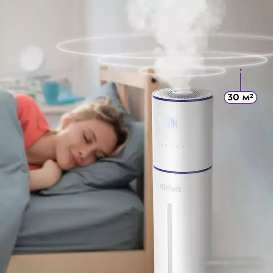 Увлажнитель воздуха Kitfort KT-2879 помогает поддерживать комфортную влажность в комнате до 90%, что особенно важно для здоровья и хорошего самочувствия. Он работает на электросети и потребляет всего 25 Вт, что делает его энергоэффективным. Устройство имеет большой резервуар на 6,7 литров, поэтому его можно использовать без частой заправки до 22 часов. Увлажнение осуществляется ультразвуковым методом, он тихий и имеет уровень шума всего 50 дБ. Можно управлять им сенсорной панелью,设с помощью пульта и устанавливать таймер или ночной режим для комфортного использования ночью. Благодаря регулировке направления пара и встроенной ароматизации, воздух можно сделать приятнее и свежее. Он также оснащен функцией антибактериальной обработки воды и ионизации для улучшения качества воздуха.