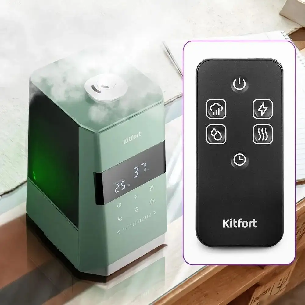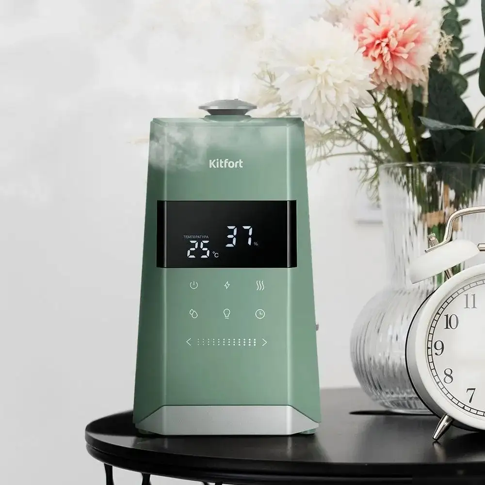 Увлажнитель воздуха Kitfort KT-3824 производства Китая поможет поддерживать комфортный уровень влажности в помещении до 75%. Он работает по ультразвуковому методу и способен увлажнять площадь до 35 м² с производительностью 450 мл/ч. В устройстве есть сенсорное управление, индикация влажности, температуры и уровня воды, а также таймер на 1-12 часов для автоматического отключения. Объем резервуара для воды составляет 6 литров, что позволяет увлажнять воздух до 13 часов подряд. К тому же, есть функция ионизации для очистки воздуха и защита от известкового налета, что продлевает срок службы прибора. Компактный и легкий, он легко помещается в любой комнате и работает тихо — всего 0–35 дБ. Устройство удобно управлять с пульта и оно может быть интегрировано в умный дом.