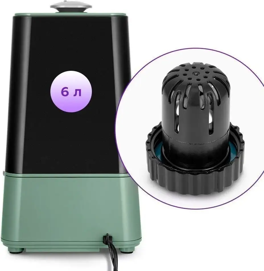 ультразвуковой, помещение до 35 м×, производительность 450 мл/ч, резервуар 6 л, гигростат, ионизация, шум 0 дБ, цвет зеленый