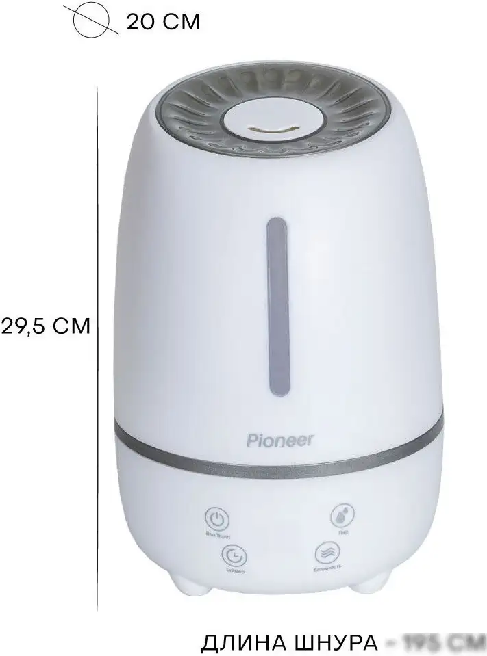 Увлажнитель воздуха Pioneer HDS31 предназначен для увлажнения помещений до 32 м². Он использует ультразвуковой метод, который быстро и тихо работает, создавая влажность без лишнего шума — всего 30 дБ. Устройство питает сетью 230В и потребляет всего 25 Вт энергии. Объем резервуара для воды составляет 4,8 литра, что позволяет увлажнять воздух до 35 часов без дозаправки. Увлажнитель имеет сенсорное управление, показывает уровень влажности и наличие воды на дисплее. Таймер помогает задать время работы, а функция ароматизации добавляет приятный запах. Защита от известкового налета увеличивает срок службы. Размеры устройства компактны: 20 на 20 и 29,5 см, его легко разместить в любом уголке.