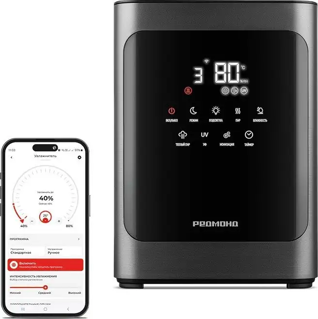 Увлажнитель воздуха Redmond HF2201S помогает поддерживать комфортную влажность в помещении до 80%. Он работает по ультразвуковой технологии, быстро увлажняя воздух объемом до 30 м², с производительностью 350 мл в час. В устройстве есть автоматическое поддержание уровня влажности и встроенный датчик влажности. Управлять увлажнителем легко через сенсорное управление, пульт или фирменное приложение по Wi-Fi, включая функции таймера и ночного режима. Емкость резервуара для воды составляет 4.8 литра, что обеспечивает долгую работу без частой доливки. Устройство издает минимум шума — всего 40 дБ, и им удобно пользоваться благодаря подсветке корпуса. Оно также оснащено функциями ионизации и антибактериальной обработки воды для безопасного использования. Благодаря функции "Теплый пар" можно выбрать оптимальный режим увлажнения в разное время года.