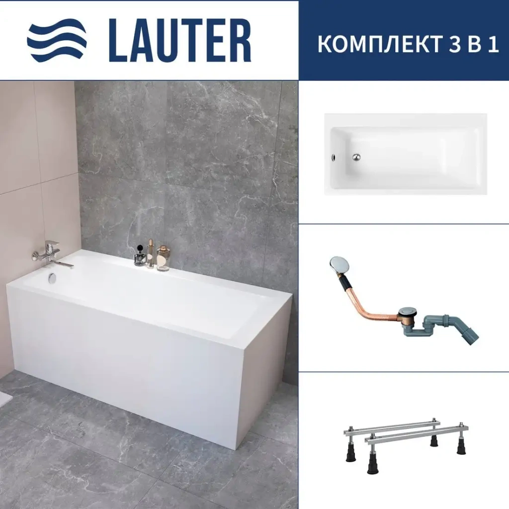Ванна Lauter Seraphina имеет прямую форму и размеры 170x80 см, что обеспечивает комфортную толщину для одного человека. Она сделана из прочного акрилового материала, который быстро нагревается и легко очищается. Ванна поставляется с ножками, обеспечивающими стабильность, а также сифоном в хромированном исполнении для удобства установки. Цвет белого глянца придает комнате свежий и стильный вид. Высота ванны составляет 58 см, глубина — 43 см, что удобно для входа и выхода. Она не оснащена массажной системой, душевой кабиной или функциями дезинфекции, но полностью подходит для классической ванной процедуры. Каркас продается отдельно, что позволяет выбрать оптимальное решение под интерьер. Ванна не имеет встроенных ручек, смесителя или подсветки, что делает ее проще и легче в уходе.