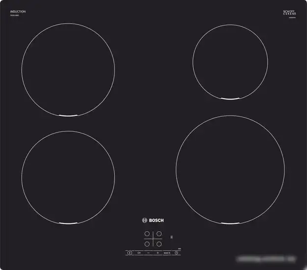 Варочная панель Bosch PIE611BB5E — это удобное устройство для кухни с четырьмя индукционными конфорками. Она выполнена из прочной стеклокерамики черного цвета и управляется сенсорными кнопками, что делает использование простым и приятным. Панель имеет цифровой таймер и индикатор остаточного тепла, что помогает контролировать процесс готовки и безопасно выключать конфорки. Есть блокировка от детей для дополнительной безопасности. Мощность конфорок достигает 7 400 Вт, а благодаря функции Booster можно быстро нагревать блюда. Управление расположено спереди, что удобно для пользователя.