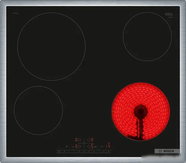 Варочная панель Bosch Serie 4 PKE645FP2E выполнена из стильной черной стеклокерамики, что делает её современным и удобным решением для кухни. Она оснащена четырьмя конфорками с быстрогорящими элементами HiLight, что позволяет быстро нагревать блюда и экономить время. Управление осуществляется с помощью сенсорной панели спереди, а также есть слайдер для удобства настройки мощностей. Панель оборудована таймером и индикатором остаточного тепла, что делает её более безопасной и удобной в использовании. Также есть блокировка от детей, чтобы предотвратить случайные нажатия.