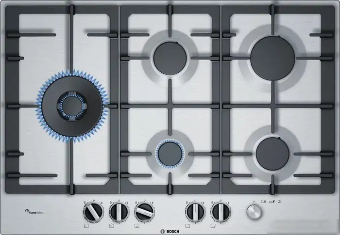 Варочная панель Bosch Serie 6 PCS7A5M90 — это надежное устройство для готовки на газу. Она оснащена пятью газовыми конфорками, включая конфорку WOK для быстрого приготовления больших блюд. Рабочая поверхность изготовлена из нержавеющей стали, что делает её устойчивой к царапинам и легко очищается. Управление механическое, расположено спереди для удобства использования. Панель имеет девять уровней мощности, что позволяет точно регулировать тепло. Электроподжиг обеспечивает быстрый запуск конфорок одним нажатием. Газ-контроль помогает снизить риск утечки газа, делая приготовление безопасным. Высота и ширина панели подходят для стандартных кухонных ниш, а прочные чугунные решетки обеспечивают стабильность посуды. Эта модель не имеет встроенных программ и автоматик, но гарантирует надежную работу и удобство в использовании. Она отлично подойдет тем, кто ищет функциональную газовую панель с качественной сборкой.