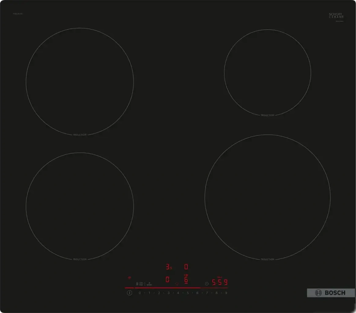 Варочная панель Bosch Serie 6 PIE61RHB1E – это удобное устройство с четырьмя индукционными конфорками, которое быстро нагревает блюда. Рабочая поверхность выполнена из стеклокерамики, что делает её простой в уходе и стильной. Сенсорное управление и слайдер позволяют легко менять настройки прямо во время готовки. Панель оснащена таймером и индикатором остаточного тепла, что повышает безопасность использования. Есть блокировка от детей, которая предотвращает случайные включения. Быстрый нагрев и функция Booster помогают сократить время приготовления и сэкономить энергию. Также поддерживается удалённое управление через Wi-Fi, что добавляет комфорт в использование. Размер панели – 59,2 см в ширину и 52,2 см в глубину, она легко вписывается в приставленную нишу шириной 56 см. Этот прибор отлично сочетает простоту, безопасность и современные функции для удобной готовки.