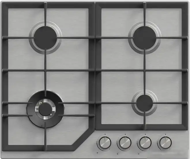 газовая на 4 конфорки, нержавеющая сталь, мощность: 8800 Вт, автоматический электроподжиг, газ-контроль, решетки: чугун, независимая установка, размеры (ШхГ): 61x51 см
