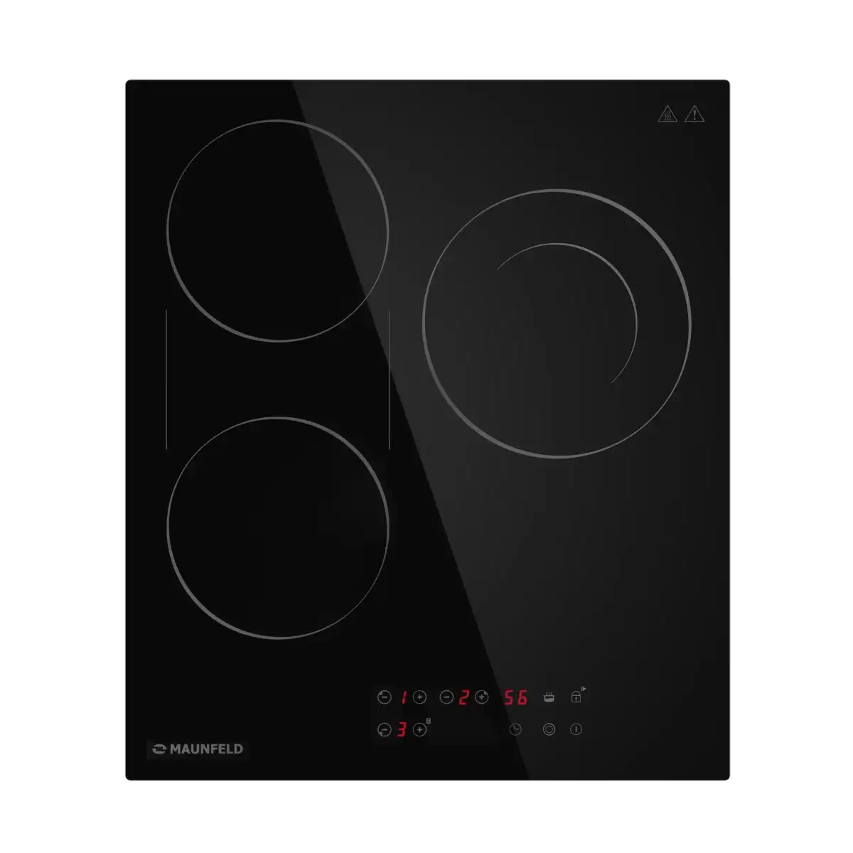 Варочная панель MAUNFELD CVCE453BDBK — это удобное устройство с сенсорным управлением и оригинальным ретродизайном в черном цвете. У неё есть три конфорки с быстрым нагревом HiLight, которые быстро нагреваются и помогают готовить быстрее. Панель выполнена из прочной стеклокерамики, легко очищается и выглядит красиво. Управление расположено спереди и включает кнопку +/-, а также таймер и индикатор остаточного тепла, что делает использование удобным и безопасным. Важной особенностью является блокировка от детей, что защищает от случайных нажатий.