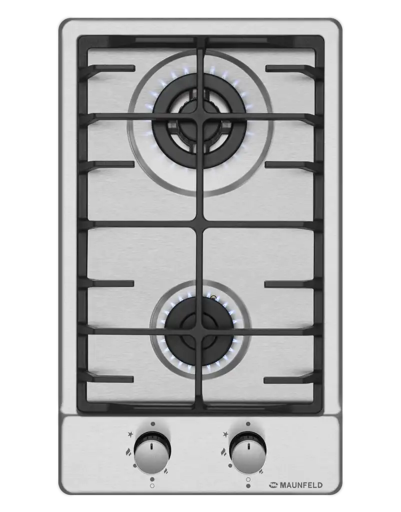газовая на 2 конфорки, нержавеющая сталь, мощность: 4700 Вт, автоматический электроподжиг, газ-контроль, решетки: чугун, независимая установка, размеры (ШхГ): 32x52 см