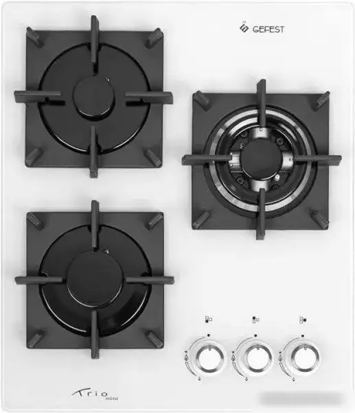 газовая на 3 конфорки, закаленное стекло, мощность: 5950 Вт, автоматический электроподжиг, газ-контроль, решетки: чугун, независимая установка, размеры (ШхГ): 45x52.5 см
