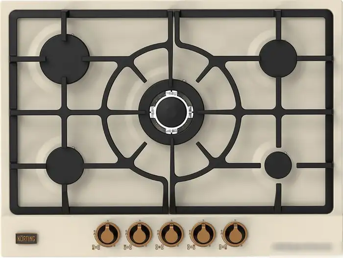 Варочная панель Korting HG 761 CTB — это независимая газовая поверхность с пятью конфорками, выполненная из эмалированной стали в цвете слоновая кость. Управление осуществляется механически спереди, есть электроподжиг и газ-контроль для безопасности. На панели есть одна сверхмощная конфорка для быстрого нагрева и четыре обычных для разнообразных блюд. Конфорки имеют разный диаметр и мощность, что удобно для готовки различных объемов. Корзины и решётки выполнены из чугуна, хорошо удерживают посуду. Эта модель отлично подходит для тех, кто ценит надёжность и классический дизайн.