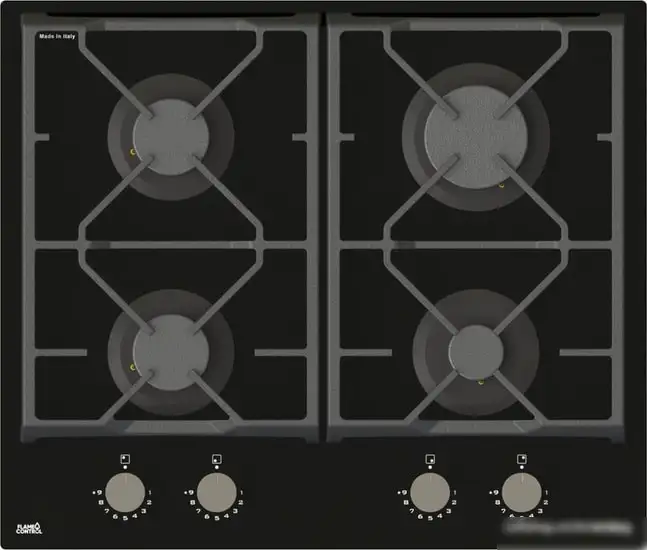 газовая на 4 конфорки, закаленное стекло, мощность: 6950 Вт, автоматический электроподжиг, газ-контроль, решетки: чугун, независимая установка, размеры (ШхГ): 60x51 см