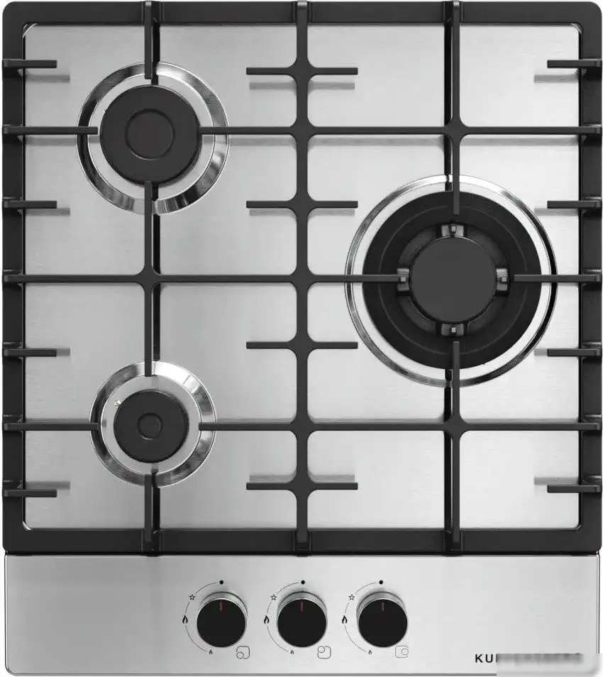 газовая на 3 конфорки, нержавеющая сталь, мощность: 6150 Вт, автоматический электроподжиг, газ-контроль, решетки: чугун, независимая установка, размеры (ШхГ): 44.5x50 см