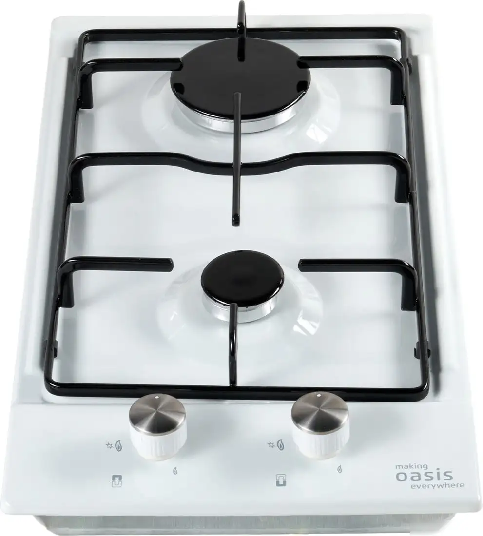 Варочная панель Making Oasis Everywhere P-MEWGD — это простая и удобная газовая поверхность с двумя конфорками. Она сделана из эмалированной стали и имеет белый цвет, что хорошо вписывается в любой кухонный дизайн. Управление осуществляется механически спереди, что позволяет легко регулировать нагрев. Панель не имеет дополнительных функций, таких как таймер или автоматические программы, но оснащена электроподжигом и газ-контролем для безопасности. Размеры панели: ширина 29 см и глубина 51 см, что подходит для среднего кухонного пространства. Вес модели — около 4,35 кг, а для встроенного монтажа нужна ниша примерно 27,3×49 см. Эта панель идеально подойдет для тех, кто ищет надежную и простую в использовании газовую поверхность.