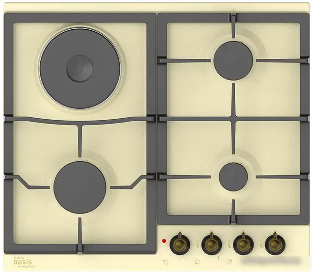 Варочная панель Oasis (Making Oasis Everywhere) P-MRK31 — это независимая газово-электрическая поверхность, выполненная из эмалированной стали и окрашенная в бежевый цвет. Она оснащена четырьмя конфорками, среди которых есть чугунные для долговечности и надежности. Управление происходит механически, расположено спереди, что удобно при использовании. Панель включает электроподжиг и систему газ-контроль для безопасности. Ее размеры: ширина 58 см и глубина 51 см, подходит для установки в кухонный гарнитур шириной около 56 см. Поддержка автоматических программ отсутствует, однако есть конфорки быстрого нагрева и функции автоматического электроподжиг.