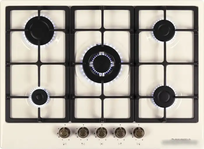 Варочная панель MAUNFELD EGHE.75.33CBG2.R/G — это надежное решение для кухни с газовыми конфорками. Она оснащена пятью конфорками, включая конфорку WOK для быстрого приготовления. Рабочая поверхность выполнена из эмалированной стали, что облегчает очистку. Управление осуществляется механически спереди, безопасно и удобно. Панель имеет автоматический электроподжиг и газ-контроль для дополнительной безопасности. Мощность всей панели составляет 10 800 Вт, что обеспечивает быстрый нагрев. Габариты модели позволяют легко встроить ее в кухонную мебель, а чугунные решетки придают прочность. Эта модель проста в использовании и подходит для тех, кто ценит качество и функциональность.