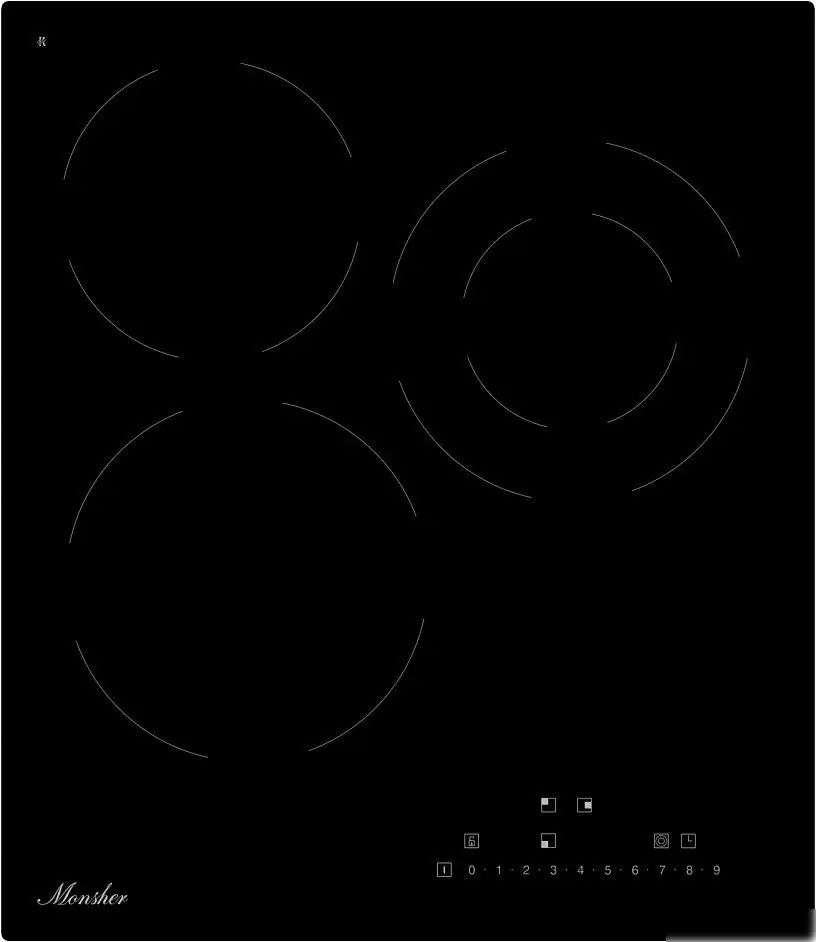 Варочная панель Monsher MHE 46 выполнена из прочной стеклокерамики и имеет черный цвет, который отлично впишется в современную кухню. Она оснащена тремя конфорками с быстро нагревающимися элементами HiLight, что позволяет быстро приготовить пищу. Сенсорное управление слайдером расположено спереди, что делает использование удобным и простым. Панель имеет электронный таймер и индикатор остаточного тепла, что повышает безопасность при готовке. Есть блокировка от детей, которая не даст случайно изменить настройки. Мощность конфорок варьируется от 1,2 до 2,0 кВт, а общая мощность — 5 000 Вт. Благодаря девяти уровням мощности и функции Booster можно точно регулировать температуру и быстро добиться нужного режима. Размеры позволяют легко встроить панель в кухонный шкаф шириной 45 см, а длина и ширина ниши для встраивания — 43х49,5 см. Варочная панель обеспечивает быстрый нагрев и комфортное управление без лишних функций.