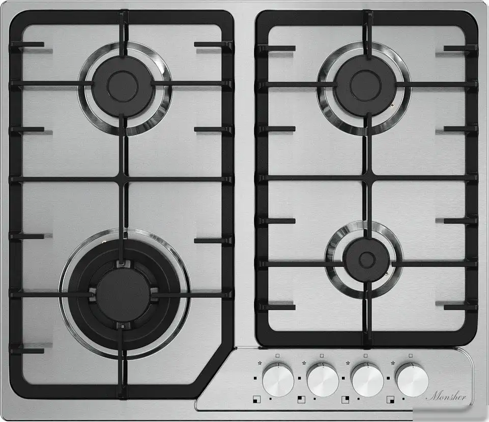 Варочная панель Monsher MSG 63 Acier — это независимая газовая поверхность с четырьмя конфорками, выполненная из нержавеющей стали. Она управляется механически с помощью удобных ручек, расположенных спереди, что обеспечивает лёгкое переключение режимов. Панель оснащена автоматическим электроподжигом и системой газ-контроля для повышенной безопасности. Чехол состоит из чугунных решеток, которые долговечны и легко моются. Мощность конфорок варьируется от 1 до 3,4 кВт, что позволяет быстро нагревать посуду и готовить разнообразные блюда. Общая мощность составляет 7 900 Вт, что обеспечивает эффективную работу. Размеры панели 58 см в ширину и 51 см в глубину, а для установки нужно ниши шириной 55,5 см и глубиной 47,5 см. Она выглядит современно благодаря стильной нержавеющей поверхности и подходит для любой кухни.