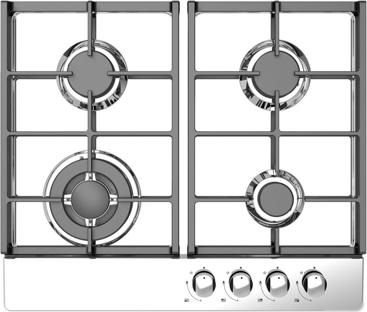 газовая на 4 конфорки, нержавеющая сталь, мощность: 7900 Вт, автоматический электроподжиг, газ-контроль, решетки: чугун, независимая установка, размеры (ШхГ): 58x50 см
