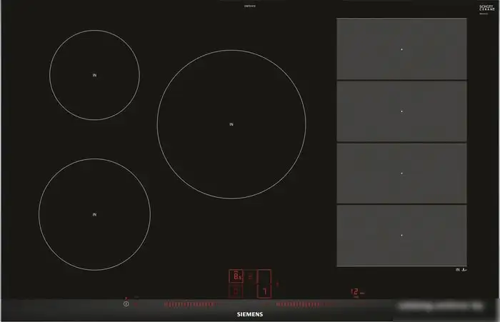 Варочная панель Siemens EX875LVC1E выполнена в современном черном цвете с сенсорным управлением спереди и скошенной рамкой. Она оснащена пятью индукционными конфорками, которые быстро нагреваются и позволяют готовить сразу несколько блюд одновременно. Благодаря панели с подсветкой и индикатору остаточного тепла, удобно следить за процессом приготовления, а блокировка от детей обеспечивает безопасность. Функция поддержания тепла и электронный таймер помогут точно регулировать процесс готовки. Удобство использования дополняет функция паузы, которая позволяет временно приостановить приготовление. Эта варочная панель легко встраивается в кухонную мебель, а её мощность и размеры подходят для стандартных ниш. В целом, устройство простое в управлении и надежное в работе.