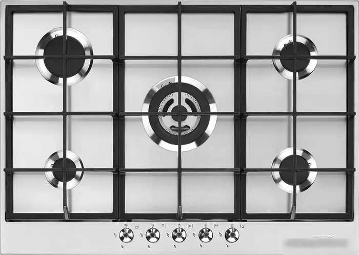 Варочная панель Smeg PX375 — это надежное устройство с пятью газовыми конфорками, включая специальную WOK-конфорку мощностью 4 кВт для быстрого приготовления. Ее рабочая поверхность выполнена из нержавеющей стали, что делает ее устойчивой к царапинам и легкой в уходе. Панель управляется механическими рычагами спереди, что удобно и быстро позволяет регулировать нагрев. Благодаря электроподжигу, зажечь конфорки можно одним нажатием, что повышает безопасность. Газ-контроль отключает газ при случайном затухании пламени, предотвращая утечки. Мощность конфорок варьируется от 1,1 до 4 кВт, что прекрасно подходит для разных блюд. Размеры панели — 72,5 см в ширину и 51 см в глубину, она легко встраивается в стандартную кухонную мебель. Ее дизайн выполнен в стиле ретро с аккуратной рамкой без лишних элементов. Эта панель отлично справляется с ежедневной готовкой и сочетает качество с простотой в использовании.