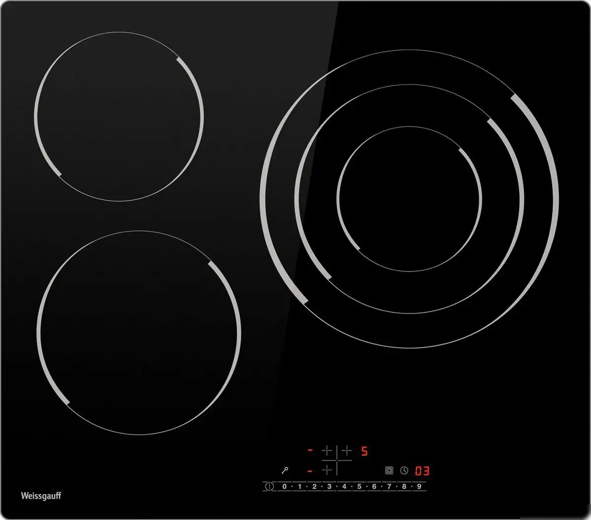 Варочная панель Weissgauff HV 633 BS изготовлена из прочной стеклокерамики и имеет 3 конфорки с быстрым нагревом HiLight. У неё сенсорное управление спереди, которое очень удобно и позволяет легко регулировать уровень температуры. Панель оснащена таймером и индикатором остаточного тепла, что помогает безопасно готовить и экономить энергию. Для защиты детей есть блокировка управления. Мощность конфорок достигает 5700 Вт, а всего уровней мощности — 9, что дает возможность точной настройки нагрева. Настройки можно менять без проводного подключения, так как панель не имеет Wi-Fi. Благодаря тройному контуру конфорки позволяют готовить разные блюда одновременно без лишних усилий. Ее размеры — шириной 58 см и глубиной 52 см, что подходит для большинства кухонных ниши.