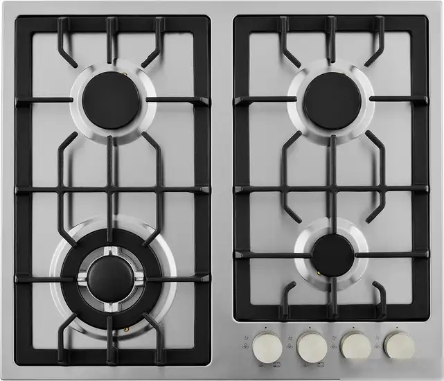 газовая на 4 конфорки, нержавеющая сталь, мощность: 8000 Вт, автоматический электроподжиг, газ-контроль, решетки: чугун, независимая установка, размеры (ШхГ): 58x50 см