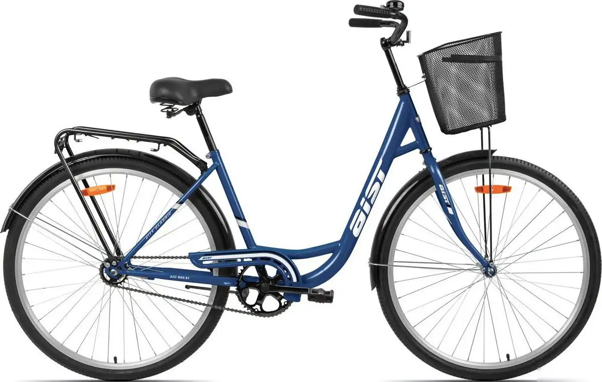 Велосипед AIST 28-245 2025 — это городской женский велосипед с прочной рамой из стали Hi-ten, рассчитанный на рост 178–185 см. Он оснащён пластиковыми платформенными педалями и вертикальным рулям для удобства при езде. Велосипед имеет 1-скоростную систему с 42-зубной звёздочкой, что обеспечивает простое управление. Колёса диаметром 28" с протектором полуслики подходят для городских улиц и дорог. Передние и задние колёса не оборудованы тормозами, что требует проверку и настройку перед ездой. В комплект входят защитные щитки, защита цепи, подножка, багажник, корзина, звонок — всё для удобства и безопасности. Рама не складная, цвет — насыщенный синий, дизайн подходит для женского городаобраза. Вилка жёсткая, без амортизации, подходит для ровных дорог. Перед использованием пользователь должен проверить давление в шинах и работу тормозов. Также важно затянуть все болты и отрегулировать высоту седла для комфортной езды.
