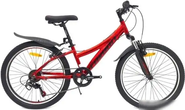 Велосипед Favorit Space 24 V — это горный велосипед, предназначенный для подростков ростом от 126 до 155 см. Он выполнен из алюминия, что делает его легким и прочным. Велосипед не имеет складной рамы и внутренней прокладки тросов, что обеспечивает надежность. Он оборудован амортизационной вилкой с пружинным механизмом и ходом 40 мм, что позволяет гладко преодолевать неровности дороги. В трансмиссии установлены 7 скоростей с внешним переключением, что помогает адаптироваться к разным условиям маршрута. Передние и задние механические тормоза обеспечивают безопасность и легкое управление. Колеса диаметром 24 дюйма с алюминиевыми ободами подходят для разных дорожных условий. В комплект входят передний и задний щитки, защита цепи и подножка для удобства. Руль оборудован стандартными грипсами, а спортивное седло обеспечивает комфорт при длительных поездках.
