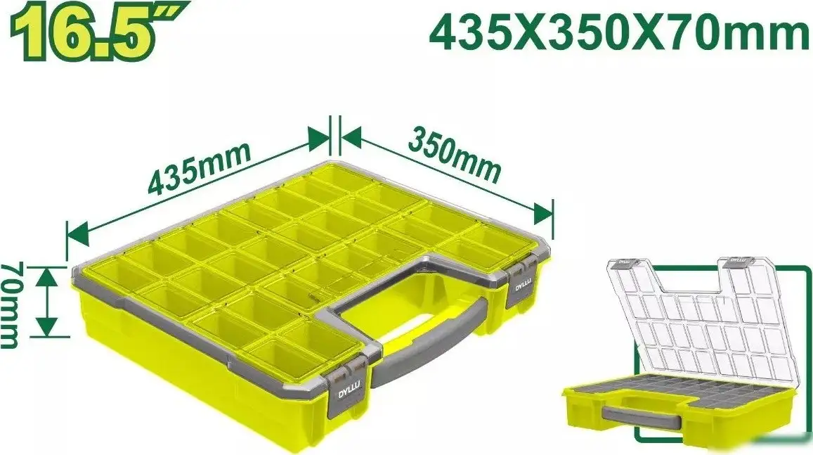 Органайзер Dyllu DTTB1611 изготовлен из прочного пластика и предназначен для хранения различных предметов. Он имеет 21 отделение, что помогает удобно разложить мелкие вещи и предметы разной формы. В организации есть съемный лоток-вкладыш, который облегчает доступ к содержимому и помогает разделять вещи по категориям. Переставные разделители внутри позволяют настроить внутреннее пространство по своим нуждам. В этом органайзере есть удобная ручка, что делает его легким для переноски. Размеры — 430 мм в длину, 350 мм в ширину и 70 мм в высоту — подходят для хранения на рабочем столе или полке. Вес органайзера составляет 2.45 кг, что обеспечивает его устойчивость и надежность при использовании.