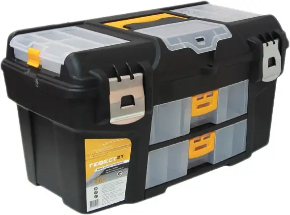 Ящик для инструментов Idea Гефест М2945 сделан из прочного пластика и имеет три отделения для удобного хранения. Он оснащен двумя металлическими замками, что помогает надежно закрепить содержимое. В крышке есть встроенные контейнеры для мелких деталей, таких как гвозди или шурупы. Размеры ящика — 530 мм в длину, 275 мм в ширину и 290 мм в высоту, что позволяет разместить разные инструменты. У ящика есть пластиковая ручка для переноски, а также удобная конструкция с замком для надежности. Для транспортировки нет наплечного ремня, что делает его легким и простым в использовании. Этот ящик — хороший выбор для хранения и транспортировки инструментов.
