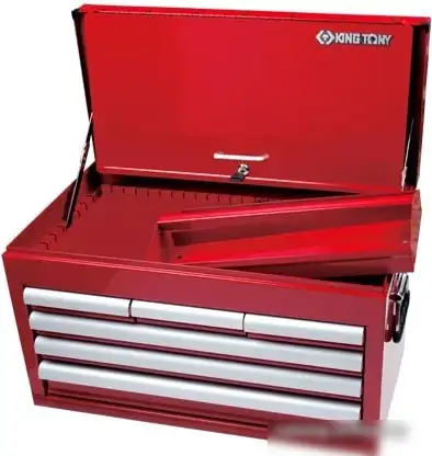 Ящик для инструментов King Tony 87411-6B выполнен из прочной стали и имеет яркий красный цвет. Он обладает семью отделениями: шесть ящиков и один отдельный отсек для хранения различных инструментов и мелочей. Внутри есть съемный лоток-вкладыш, что облегчает организацию мелких предметов. У ящика есть надёжный замок, обеспечивающий безопасность содержимого. Ручка позволяет удобно носить ящик, а его размеры (660 мм на 307 мм на 374 мм) позволяют разместить его даже в ограниченном пространстве. Вес ящика составляет 25,4 кг, что говорит о его прочности и устойчивости.