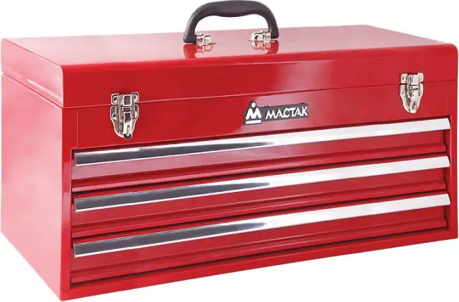 Ящик для инструментов Мастак 511-03530R выполнен из прочной стали и имеет яркий красный цвет. Он оснащен четырьмя отделениями, что помогает удобно организовать инструменты и мелкие детали. В конструкции есть два надежных металлических замка для повышения безопасности хранения. Дополнительную практичность обеспечивает съемный лоток-вкладыш, который позволяет быстро найти нужные инструменты. Размеры ящика: длина 530 мм, ширина 220 мм, высота 285 мм, а вес — 8,7 кг, что делает его удобным для переноски и хранения. Ручка на крышке обеспечивает комфорт при переносе, а отсутствие колес и наплечного ремня делает его легким и надежным в использовании. Этот ящик отлично подойдет для хранения и транспортировки различных инструментов и принадлежностей, обеспечивая порядок и безопасность.