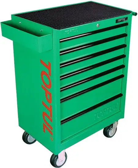 Ящик для инструментов Toptul TCAA0501 выполнен из прочной стали и имеет семь отделений для удобного хранения. Его ярко-зеленый цвет помогает легко найти его в мастерской или на стройке. В ящике есть удобная ручка для переноски, как ручная, так и с колесиками, что облегчает транспортировку. Размеры ящика позволяют разместить в нем разные инструменты, а его конструкция устойчивая и надежная. Он не оснащен держателем для бит и сверл, поэтому подходит для тех, кто ценит простоту и функциональность.