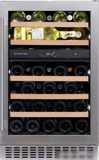 Винный шкаф Dunavox DAUF-38.100DSS — это встроенное устройство, которое хранит до 38 бутылок вин. Он оснащен двумя зонами с отдельным управлением и электронным сенсорным управлением, позволяющим точно регулировать температуру в диапазоне от 5 до 20 °C. В холодильной камере использована компрессорная технология охлаждения, которая обеспечивает стабильную температуру и хорошую работу при низком уровне шума — всего 40 дБ. Шкаф имеет стеклянную дверь с двусторонним открыванием и антибактериальным фильтром для защиты напитков. Полки выполнены из дерева, что придает стильный вид и защищает бутылки. Внутренний вентилятор равномерно распределяет прохладу, а индикация температуры помогает отслеживать условия хранения. Устройство занимает немного места — шириной 49.5 см и высотой 82 см, идеально подходит для встраивания в кухонный гарнитур.